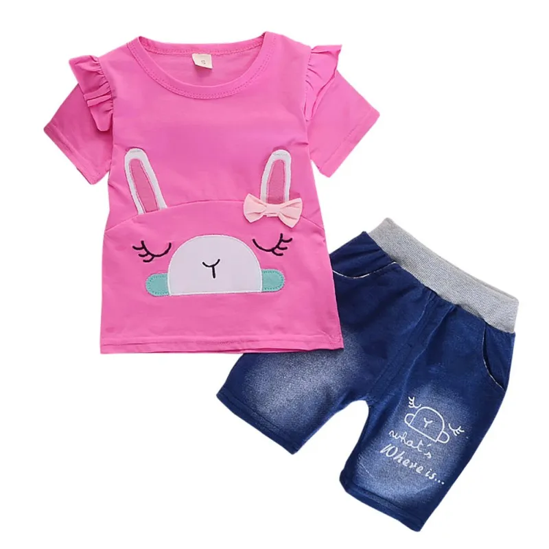 استعارات ل طفل الفتيات ملابس الصيف قصيرة الأكمام الكرتون إلكتروني تي شيرت مطبوع قمم + الدنيم السراويل الدعاوى الفتيات مجموعة ملابس عارضة