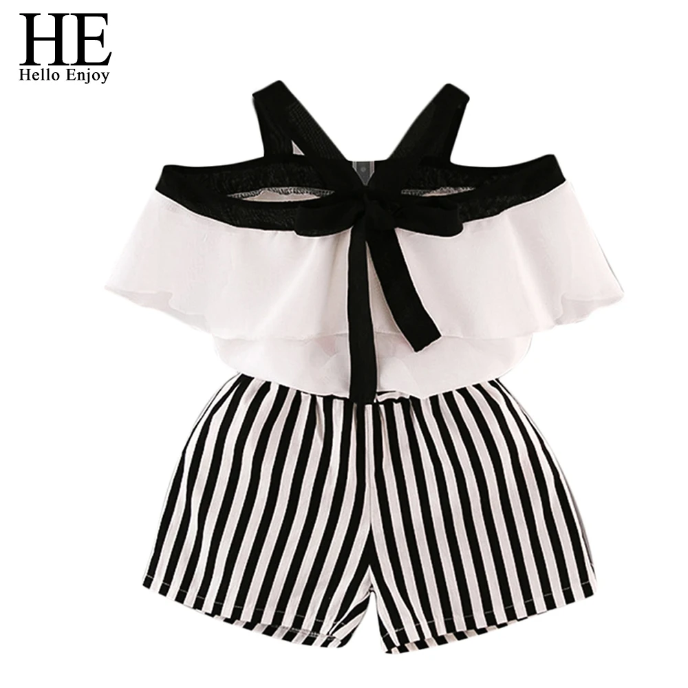 صور من انه مرحبا التمتع الصيف الفتيات الملابس مجموعات الأطفال الملابس أزياء فتاة قميص أعلى + مخطط السراويل الدعاوى 2019 الاطفال الملابس 2 قطعة